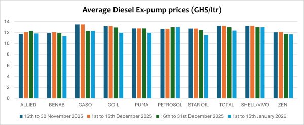 Pump prices of diesel also declined by an average of about 2.41% in 2025. Compared to the same period last year, pump prices of diesel are down by 21.63%. Diesel is currently being sold below GHS12 per liter among some OMCs.