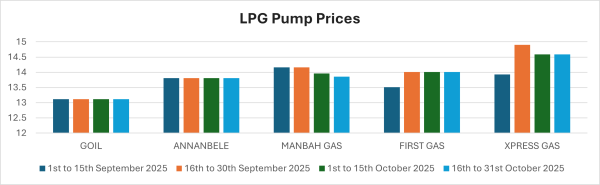 Average pump prices of diesel declined by 2.57% from GHS13.6700/Ltr to GHS13.3190/Ltr due to the significant fall in the international market price of diesel in the period. LPG also declined by 0.14% from an average of GHS13.8980/Kg to GHS13.8780/Ltr due to the decline in the international price of LPG.
